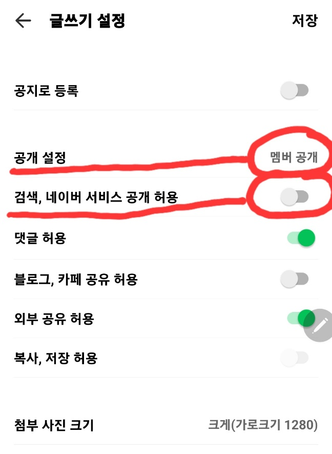 ③ 글쓰기 할 때 오른쪽 하단 톱니모양 설정 아이콘 눌러서 "공개설정"은 "멤버공개"로, "검색, 네이버 서비스 공개 허용"은 미선택
