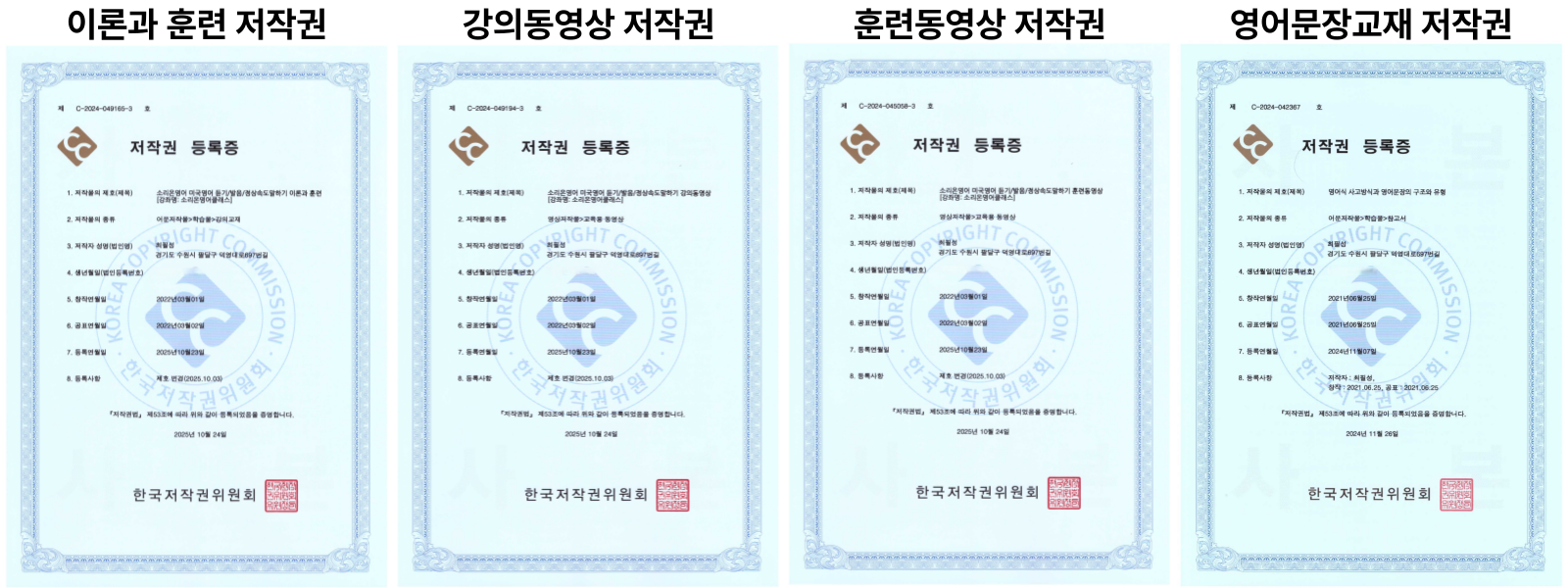 3. (지적재산권 및 주의사항) 소리온영어클래스에서 제공되는 모든 교육 콘텐츠 (이론과 훈련 내용, 강의동영상, 훈련동영상, 영어문장교재)는 한국저작권위원회에 정식 등록된 소리온영어의 지적재산으로서 저작권법에 따라 법적으로 보호됩니다.