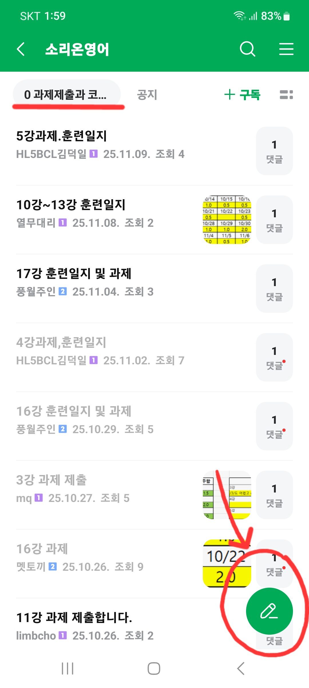 ④ 글쓰기 제목은 "2510 월요일반 차은우 1강 과제" 형식으로 (2510은 시작 연월임)