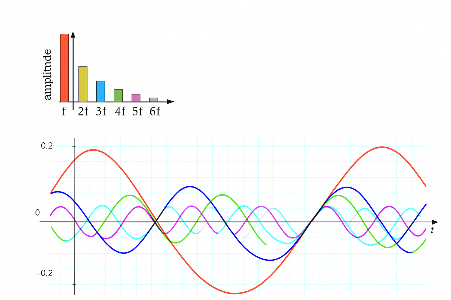 기음(F0)이란 가장 낮은 주파수를 가진 진동으로 우리 귀에 실제로 들리는 진동이고, 배음 (배수의 진동, Harmonics)은 기음의 2배, 3배, 4배 등의 주파수로 구성된 진동으로서, 첫째 배음은 기음보다 2배로 많이 진동하고 둘째 배음은 기음보다 3배 많이 진동한다. 정리하면, 한 물체의 진동은 가장 큰 진동이면서 우리 귀에 들리는 기음과 우리 귀에 들리지 않는 배음의 조합 (Harmonic spectrum)으로 이루어지며, 이 배음의 조합의 구조가 각 소리의 고유한 음색을 결정한다.