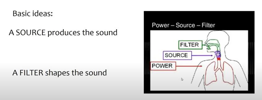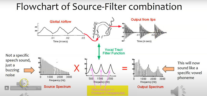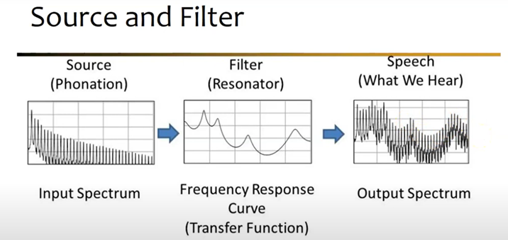 이러한 모음의 생성 과정을 음향학적으로 체계화한 이론이 바로 Source-Filter theory로서, 스웨덴 KTH 대학교의 음성학자인 Gunnar Fant와 미국 MIT 대학교의 음성학자인 Ken Stevens에 의해 완성되었다. Source-Filter theory에 따르면 사람의 음성은 Source (소리의 원천)와 Filter (여과 장치)의 상호작용을 통해 만들어진다.