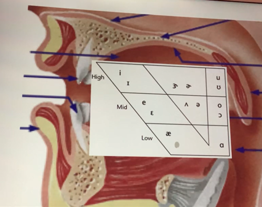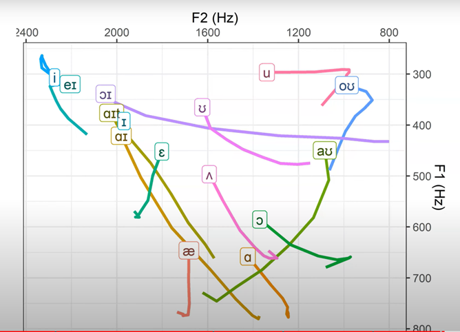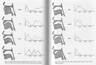 결국, 성대원음의 배음들이 혀와 입술 등의 조절을 통해 형성된 특정 형태의 성도를 통과하면서 일부 배음이 강화되고 증폭되어 공명되면서 그 결과로 고유한 음색과 주파수 특성을 지닌 특정한 모음소리가 만들어 지는 것이다. 미국영어에서는 그러한 특정한 성도의 형태가 총 15가지로 구분되는데 그것이 바로 10개의 단모음과 5개의 이중모음이다.