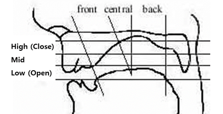 [참고] 일반적인 교재에서는, 모음 분류 시 전설모음, 중설모음, 후설모음이라는 용어를 쓰지만, 실제로 모음은 혀의 특정 부위에서만 만들어지는 것이 아니라 성도의 특정 공간에서 형성되므로, 본 교재에서는 영어식 표현인 전방모음 (Front vowels), 중앙모음 (Central vowels), 후방모음 (Back vowels)을 사용한다.