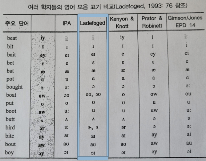 영어의 모음을 분류하고 음소로 표시하는 방법은 영국영어와 미국영어가 다르고, 또한 같은 미국영어라도 학자와 사전에 따라 분류 기준과 표기 방식이 달라서 학습자에게 혼란을 줄 수 있다. 그러나, 본 과정의 목표 언어는 미국영어이므로, 미국영어 음성학 분야에서 가장 널리 사용되는 UCLA의 음성학자 Peter Ladefoged에 의한 음소표시 체계를 기본으로 따른다.