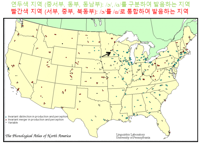 - 미국 중서부, 동부 동남부 지역에서는 /ɔ/와 /a/를 서로 구분해서 발음하지만,