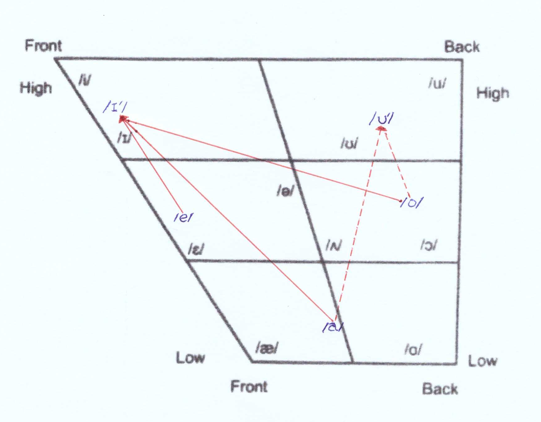 /u/ booed, boot > /ʊ/ hood, put > /ɔ/ bawed, bought > /ɑ/ bod, pot